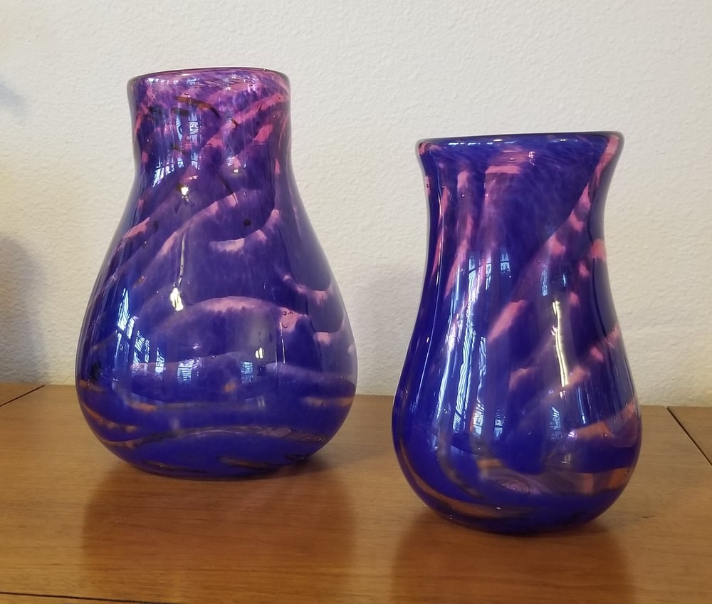 Cobalt over fuschia vase engraved cuts. Picked up hot and re shaped.