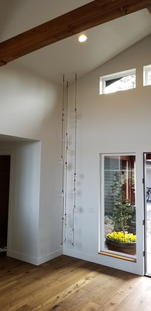 Custom installation of 18 clear blown orbs and solid glass weights on rope.