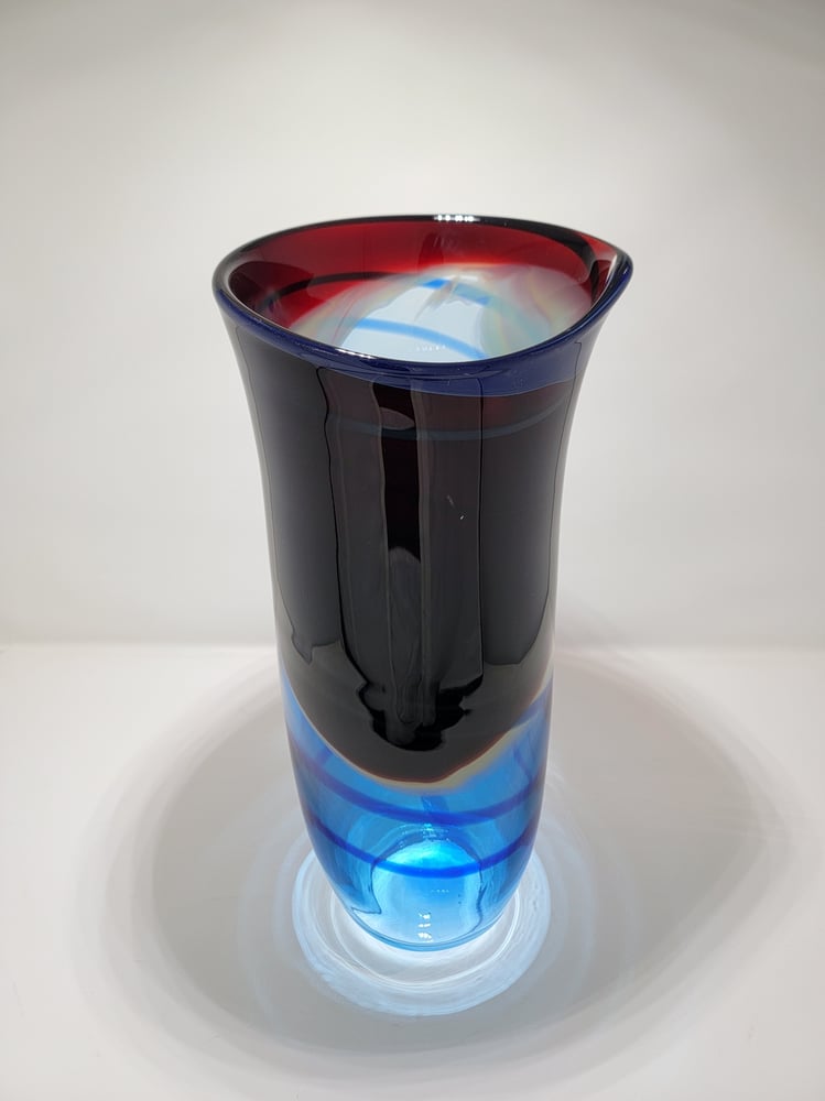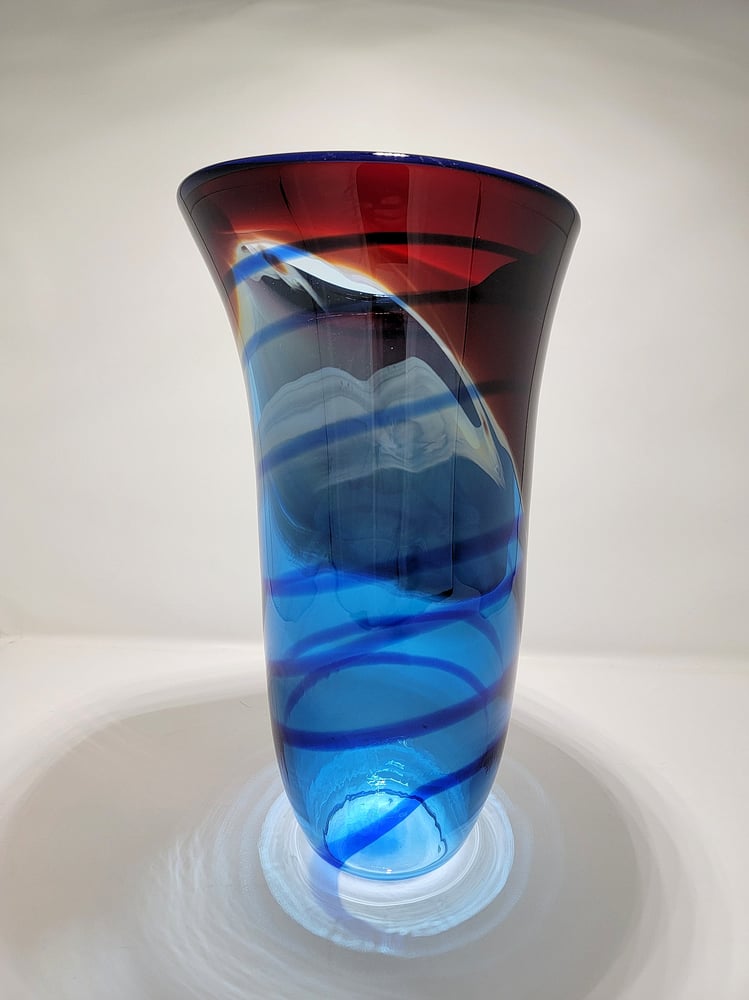 The deep aqua blue seamlessly melds with the copper ruby, suggesting whispers of mountainous terrain, while the cerulean wrap irresistibly draws the eye inward, culminating in a fiery copper ruby crescendo at the top.