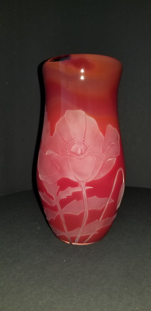 Hand blown red vase. Multi stage etching of a group of poppy flowers.